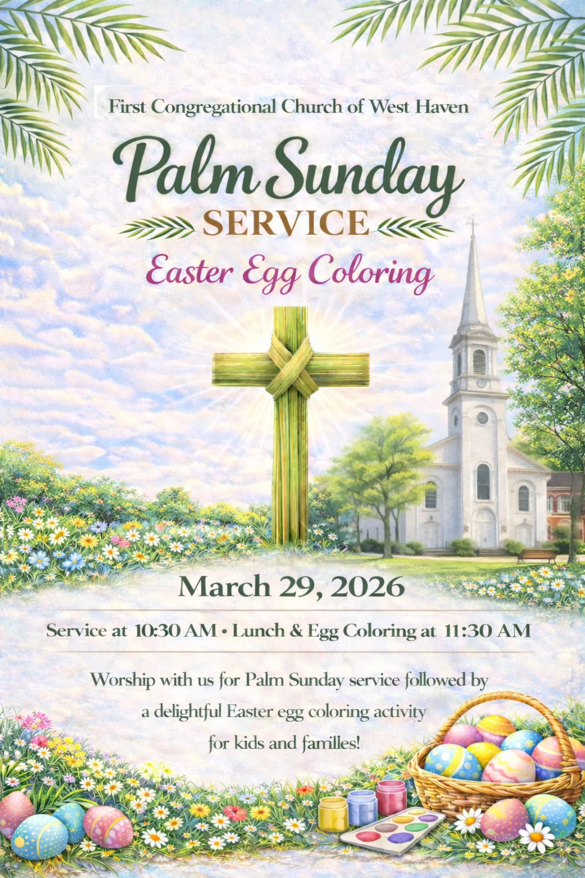 Palm Sunday Service- Easter Egg Coloring Sunday, March 29, 2026 10:30 AM 12:00 PM Google Calendar ICS